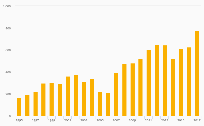 International Tourism, Expenditure (USD) rose 23.7% to USD 773 mil in Palestine in 2017