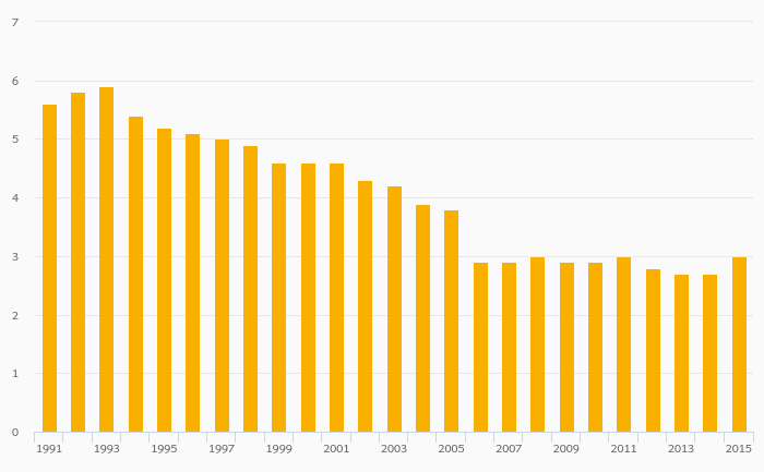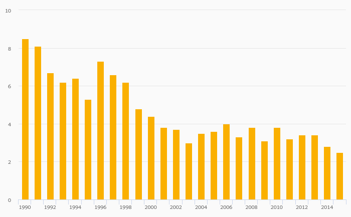 Waterways Transport In tonne-km (As % of Total Inland Freight Transport) fell 10.7% to 2.50% in Luxembourg in 2015