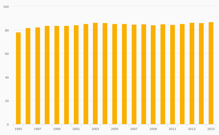 Road Transport In tonne-km (As % of Total Inland Freight Transport) rose 1.16% to 86.9% in Norway in 2015
