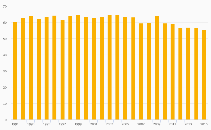 Road Transport In tonne-km (As % of Total Inland Freight Transport) fell 1.77% to 55.6% in Netherlands in 2015