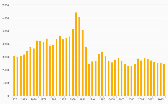 Road Injury Accidents fell 3.40% to 2,472 in Moldova in 2016