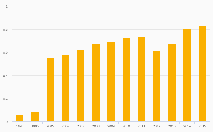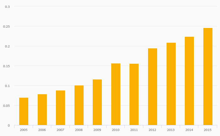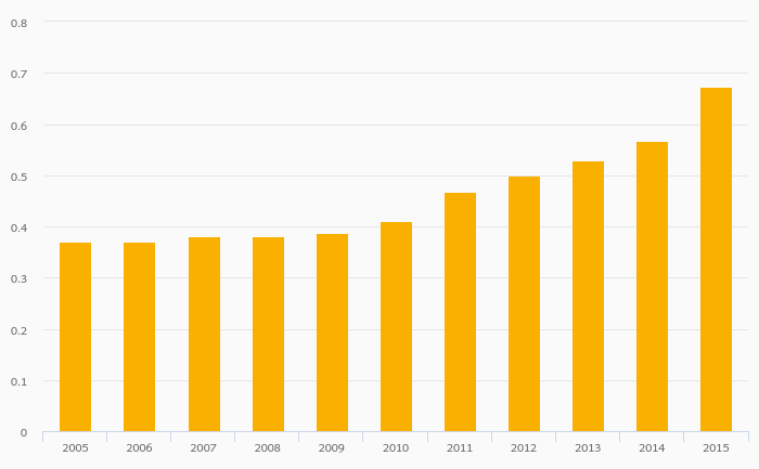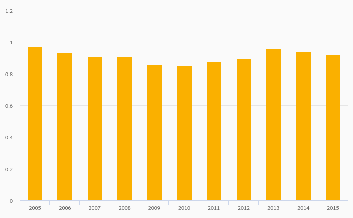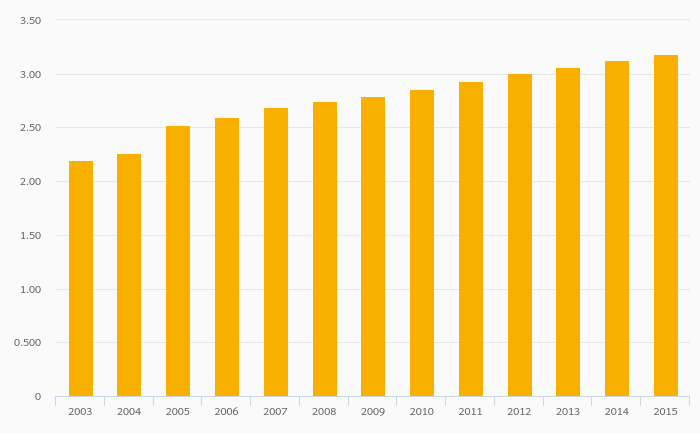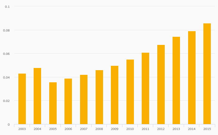 Passenger Cars Per Household rose 8.31% to 0.086 vehicles in India in 2015