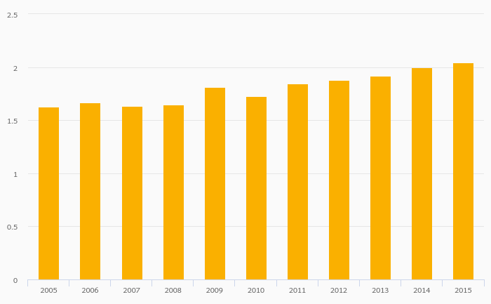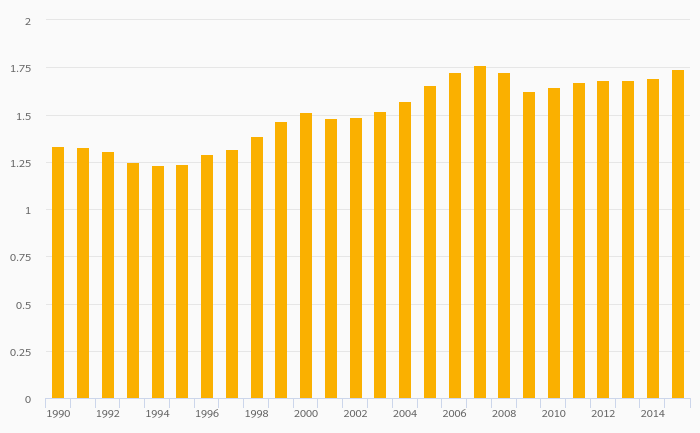 Passenger Cars Per Household rose 2.69% to 1.74 vehicles in Iceland in 2015