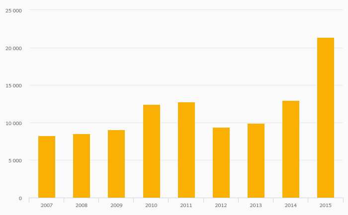 Freight and Mail on Board (Departures) - International Air Transport rose 65.1% to 21,375 tonnes in Bulgaria in 2015
