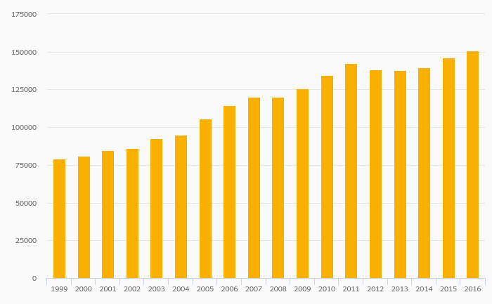 Killed In Road Traffic Accidents rose 3.18% to 150,785 persons in India in 2016