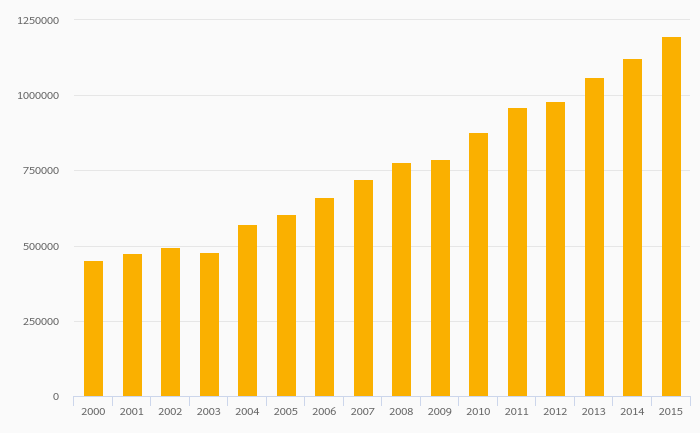 Railways Goods Transported (mil tonnes) rose 6.39% to 1,196,060 Mt in China in 2015