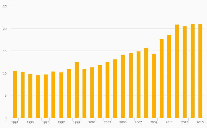 Waterways Transport In tonne-km (As % of Total Inland Freight Transport) rose 0% to 21.1% in Belgium in 2015