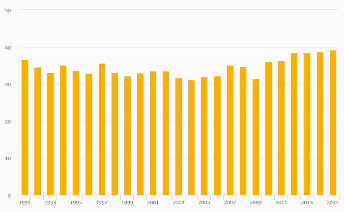 Waterways Transport In tonne-km (As % of Total Inland Freight Transport) rose 1.30% to 39.1% in Netherlands in 2015