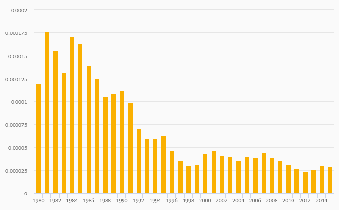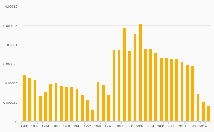Hard Coal Production (As % of Worldwide Production) fell 21.3% to < 0.001% in Swaziland in 2015