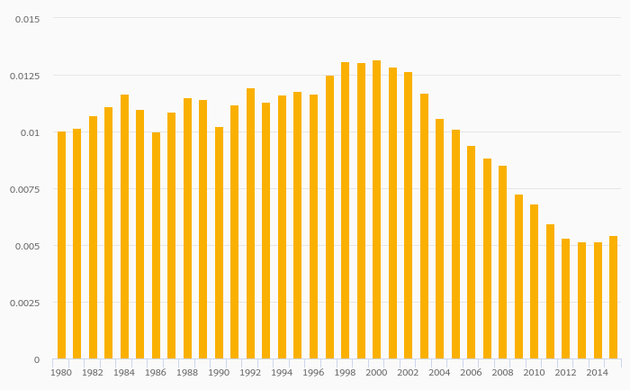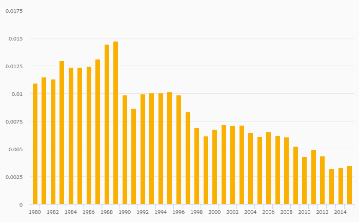 Coal Consumption (As % of Worldwide Consumption) rose 5.33% to 0.005% in Canada in 2015