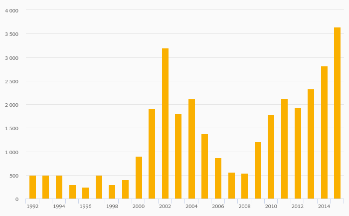Gold (Mine) Production rose 29.4% to 3,640 kg in Armenia in 2015