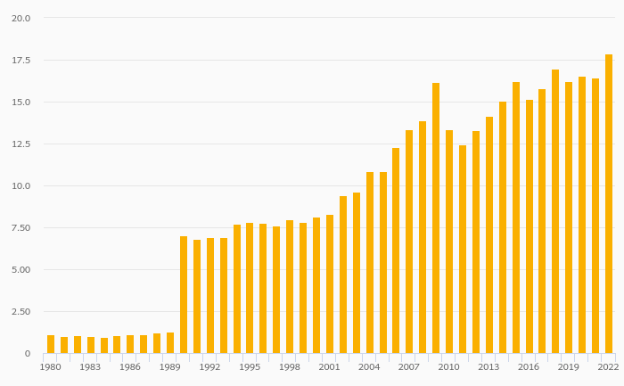 GDP Per Unit of Energy Use (PPP $ Per kg of Oil Equivalent) rose 8.72% to USD 17.9 in Nigeria in 2022