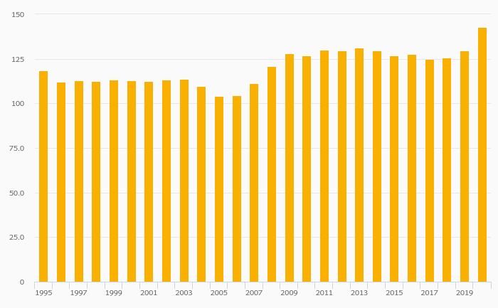 Households' Non-Financial Assets (As % of GDP) rose 10.2% to 143% in Czechia in 2020