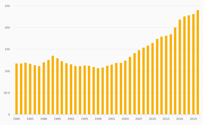 Households' Non-Financial Assets (As % of GDP) rose 3.90% to 240% in Norway in 2020