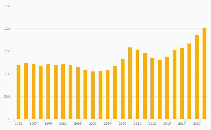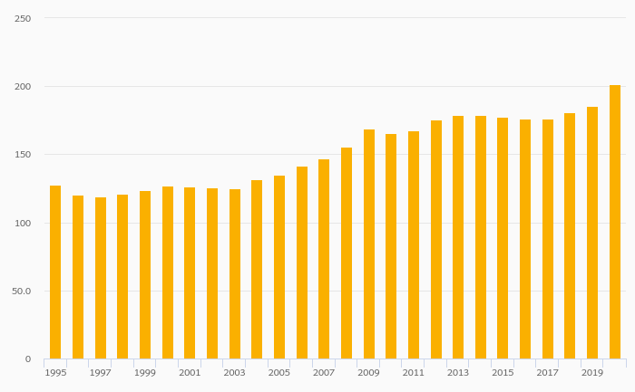 Households' Non-Financial Assets (As % of GDP) rose 8.48% to 202% in Finland in 2020
