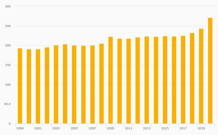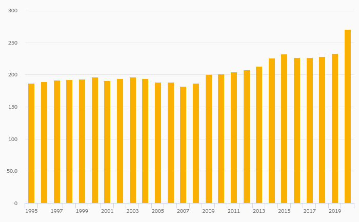 Households' Non-Financial Assets (As % of GDP) rose 15.9% to 270% in Austria in 2020