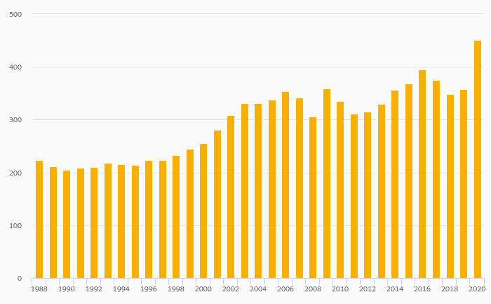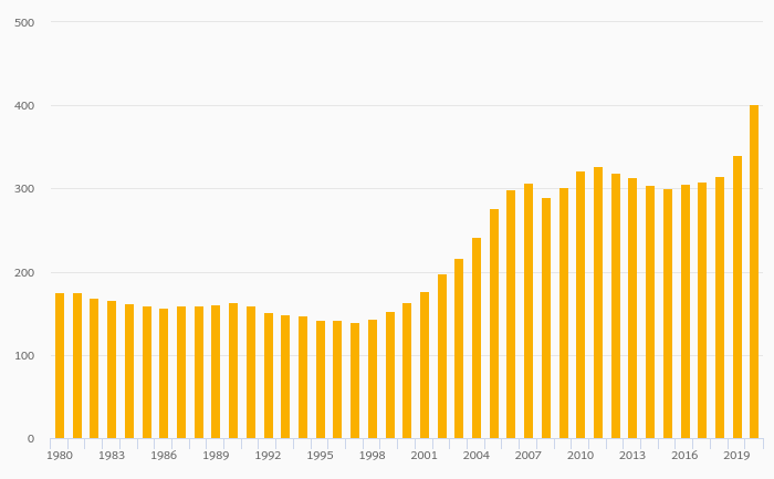 Households' Non-Financial Assets (As % of GDP) rose 18.0% to 402% in France in 2020