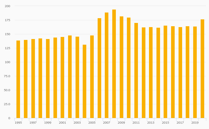 Households' Non-Financial Assets (As % of GDP) rose 7.66% to 176% in Denmark in 2020