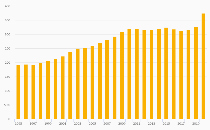 Households' Non-Financial Assets (As % of GDP) rose 14.8% to 374% in Belgium in 2020