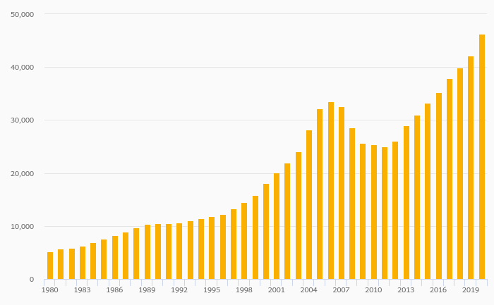 Households' Non-Financial Assets (USD) rose 9.90% to USD 46,301 bil in the USA in 2020