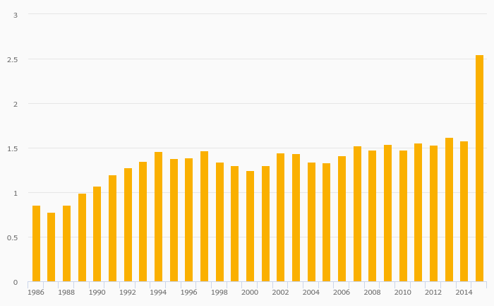 Jet Fuel Consumption (As % of Worldwide Consumption) rose 61.4% to 2.55% in Thailand in 2015