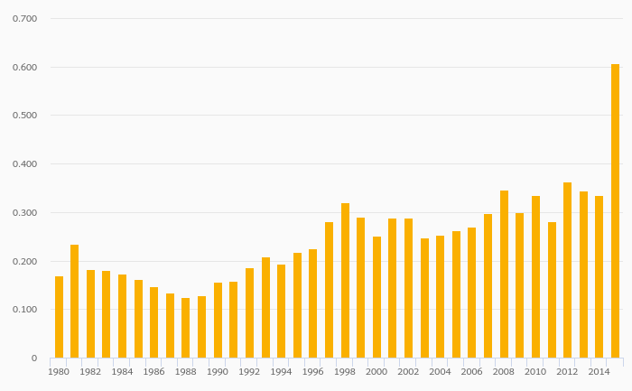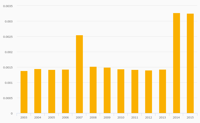 Jet Fuel Consumption (As % of Worldwide Consumption) rose 80.6% to 0.607% in Chile in 2015