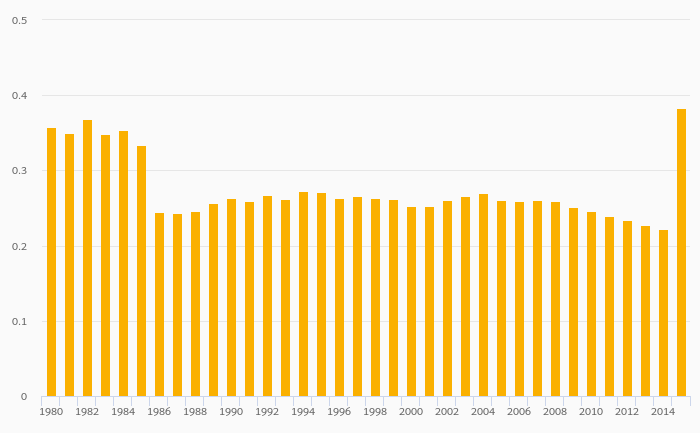 Kerosene Consumption (As % of Worldwide Consumption) rose 110% to 35.9% in India in 2015