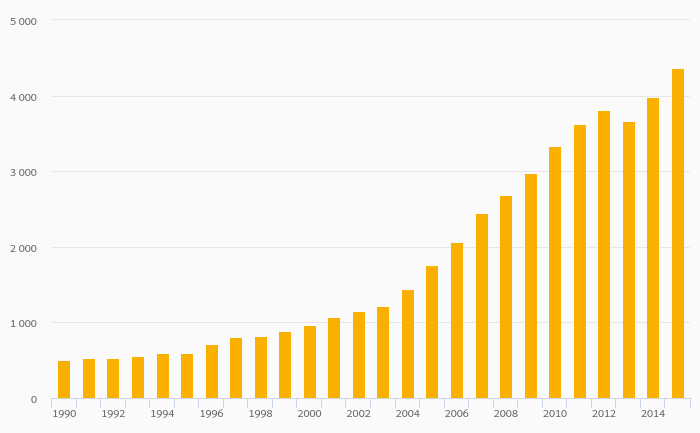 Gross Natural Gas Production rose 9.38% to 4,360 bil cb ft in China in 2015