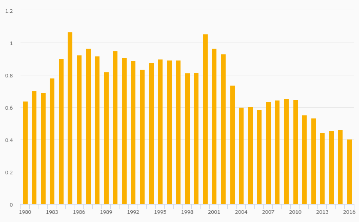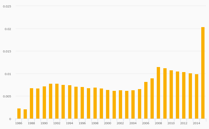 Crude Oil Supply (As % of Worldwide Supply) fell 12.0% to 0.405% in Australia in 2016