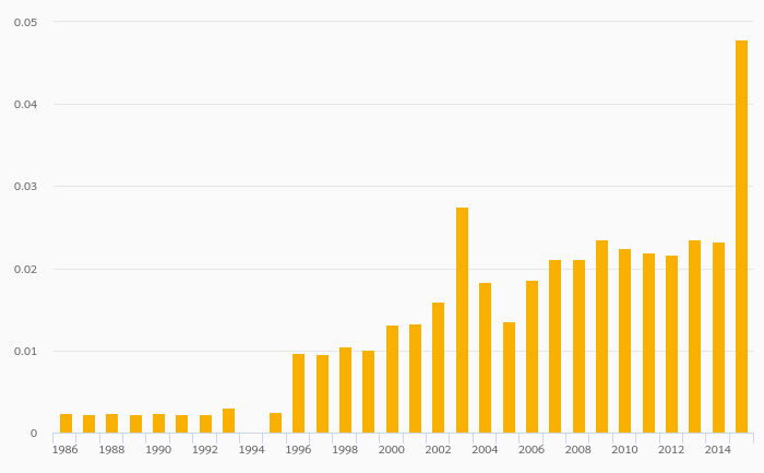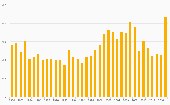 Jet Fuel Consumption (As % of Worldwide Consumption) rose 88.7% to 0.435% in Ireland in 2015
