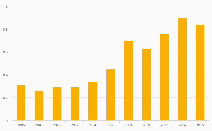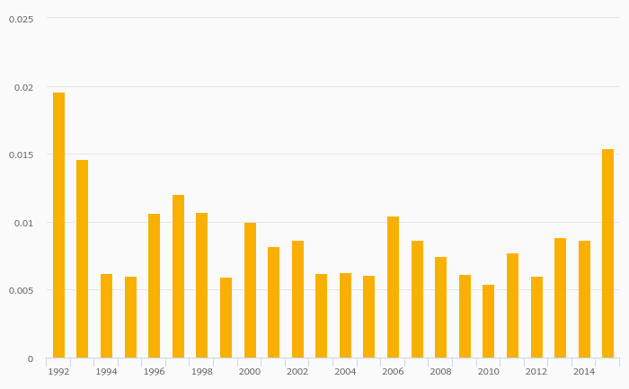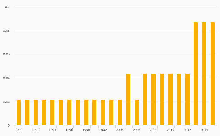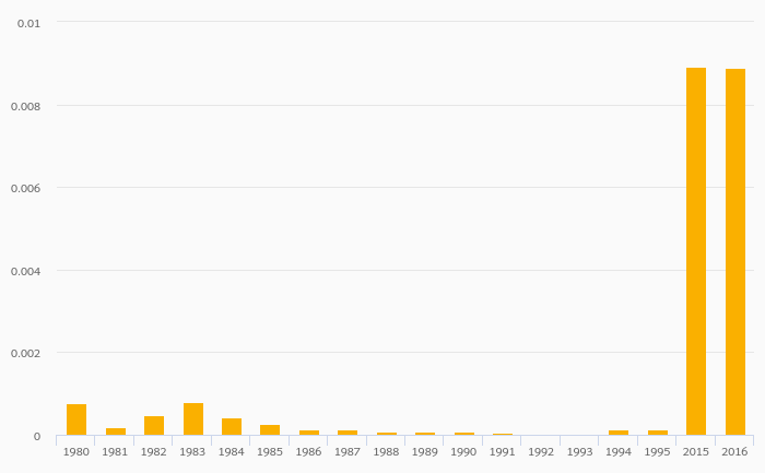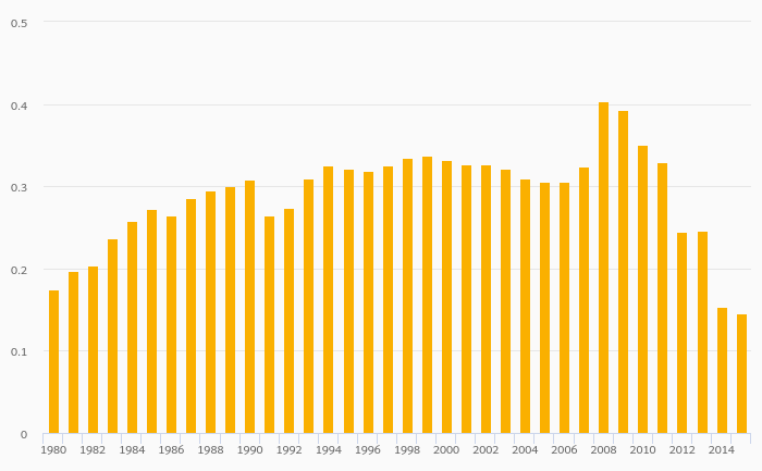 Crude Oil Supply (As % of Worldwide Supply) fell 0.436% to 0.009% in Sweden in 2016