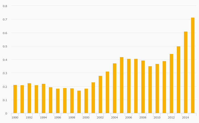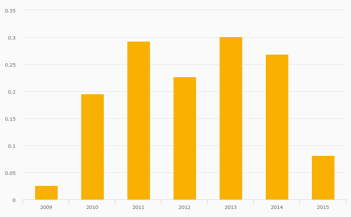 Dry Natural Gas Production (As % of Worldwide Production) fell 0.452% to 0.258% in Vietnam in 2015