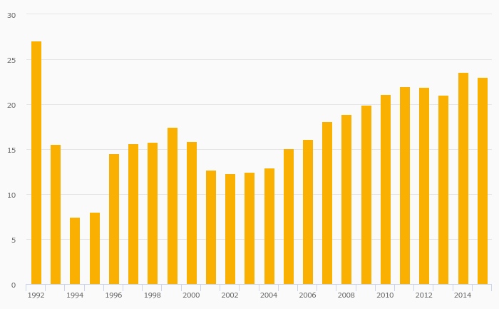 Jet Fuel Consumption (As % of Worldwide Consumption) rose 63.9% to 30.3% in the European Union in 2015