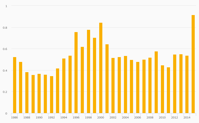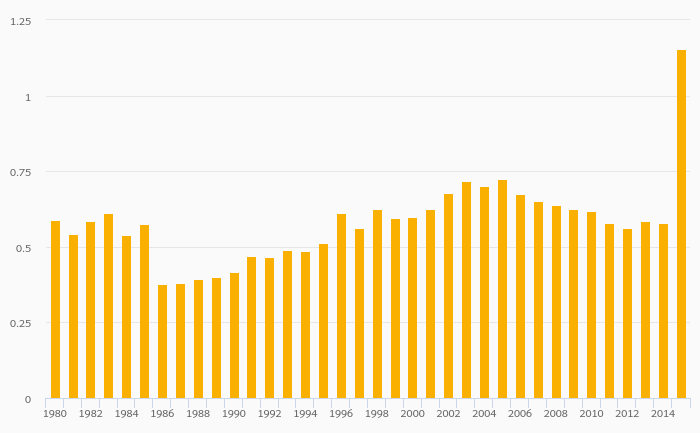 Petroleum Consumption (As % of Worldwide Consumption) rose 0.588% to 1.62% in the United Kingdom in 2015