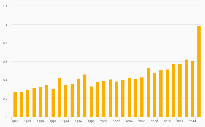 Distillate Fuel Oil Consumption (As % of Worldwide Consumption) rose 99.8% to 1.15% in Austria in 2015