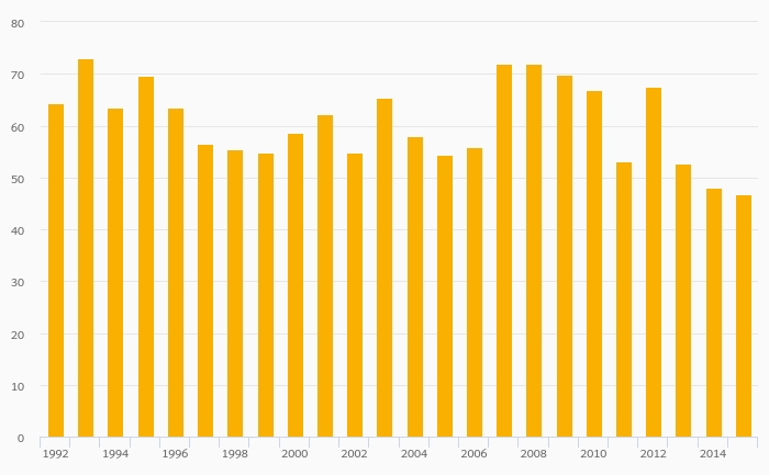 Dry Natural Gas Production fell 2.79% to 46.8 bil cb ft in Croatia in 2015