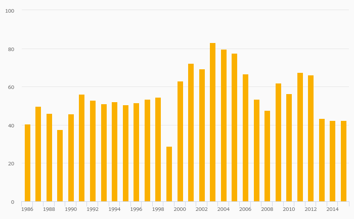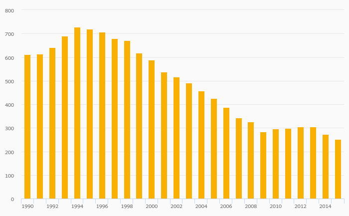 Gross Natural Gas Production fell 7.58% to 252 bil cb ft in Italy in 2015