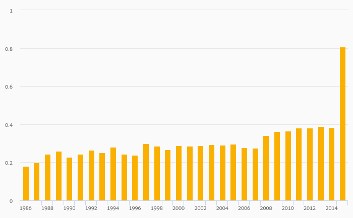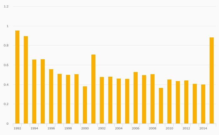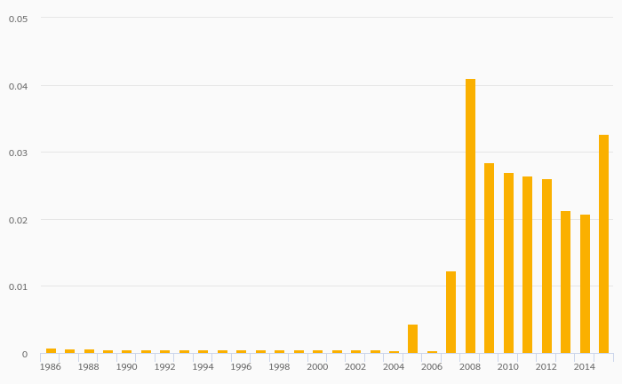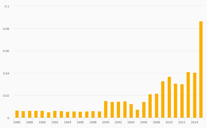 Distillate Fuel Oil Consumption (As % of Worldwide Consumption) rose 120% to 0.885% in Ukraine in 2015