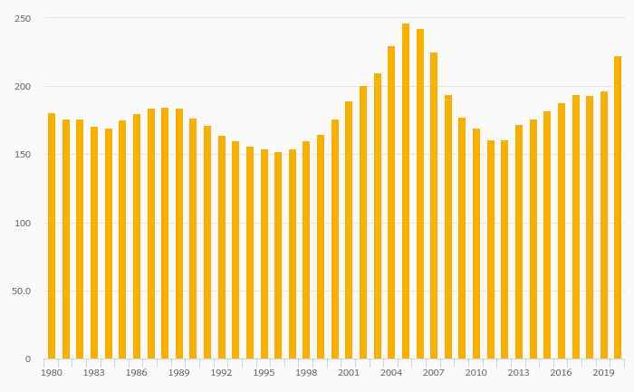 Households' Non-Financial Assets (As % of GDP) rose 13.2% to 223% in the USA in 2020