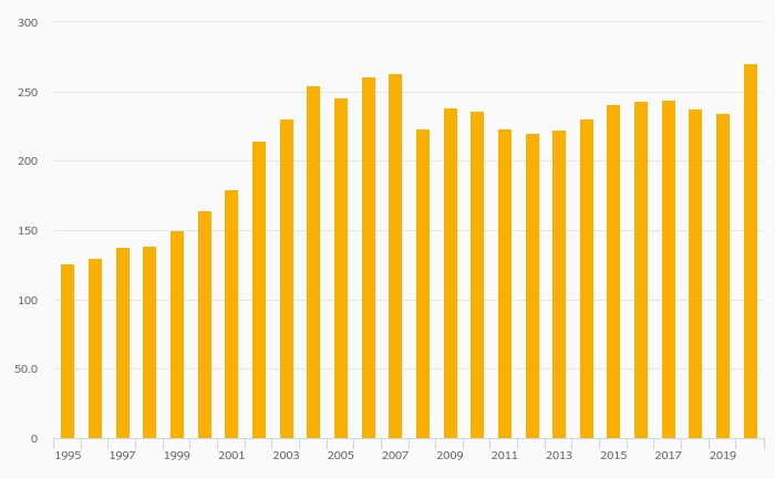 Households' Non-Financial Assets (As % of GDP) rose 15.2% to 271% in the United Kingdom in 2020