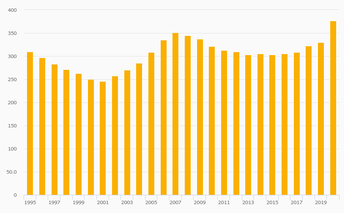 Households' Non-Financial Assets (As % of GDP) rose 14.3% to 377% in South Korea in 2020