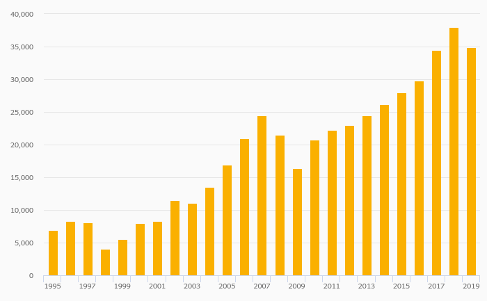 International Tourism, Expenditure (USD) fell 8.36% to USD 34,844 mil in South Korea in 2019