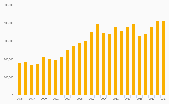 International Tourism, Expenditure (USD) rose 0.373% to USD 412,629 mil in the European Union in 2019