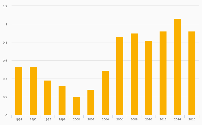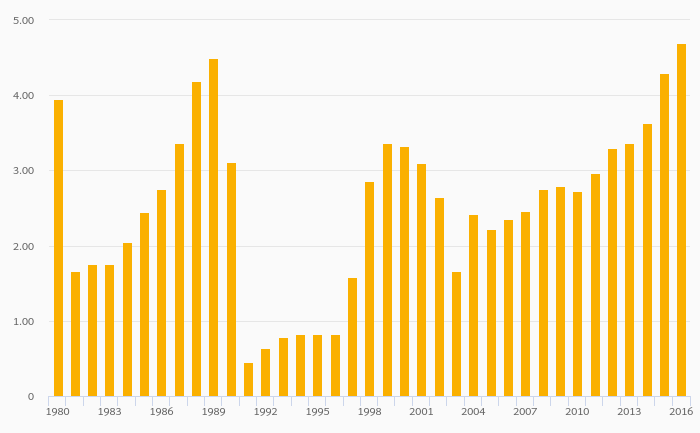 Oil Supply (As % of Worldwide Supply) rose 9.33% to 4.70% in Iraq in 2016
