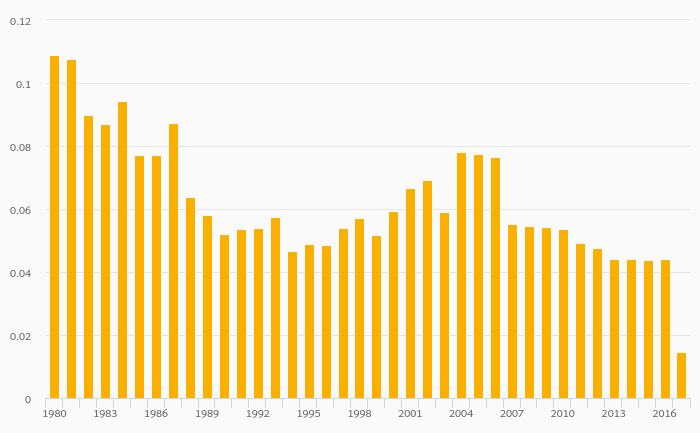 Crude Oil Reserves (As % of Worldwide Reserves) fell 66.6% to 0.015% in Trinidad and Tobago in 2017