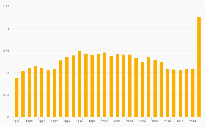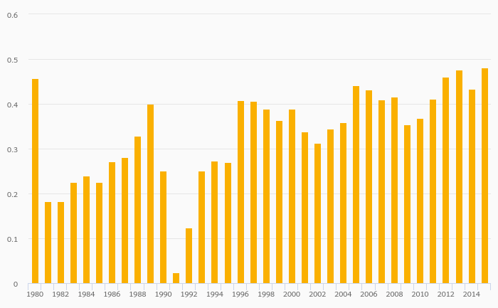 Dry Natural Gas Production (As % of Worldwide Production) rose 10.9% to 0.481% in Kuwait in 2015
