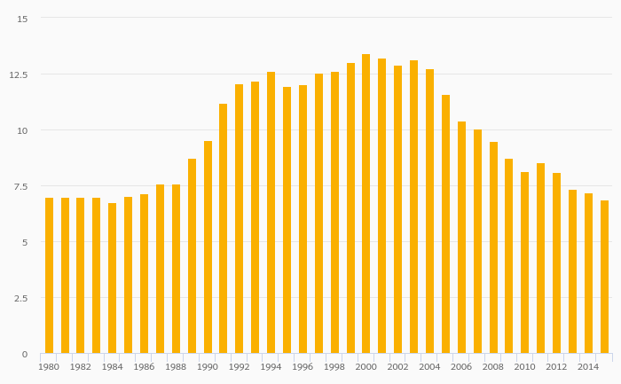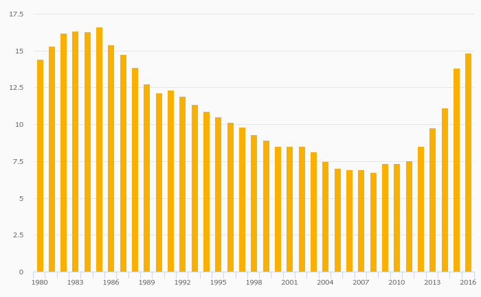 Crude Oil Supply (As % of Worldwide Supply) rose 7.30% to 14.9% in the USA in 2016