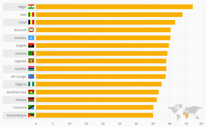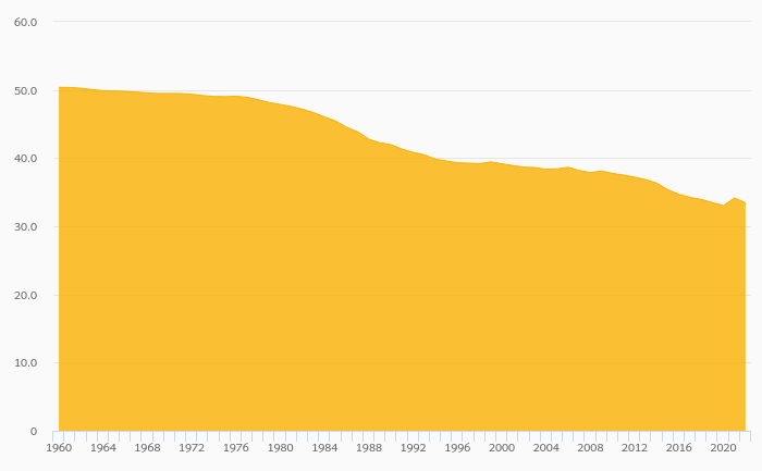 Crude Birth Rate (Per 1,000 People) fell 2.10% to 33.4 births in Senegal in 2022