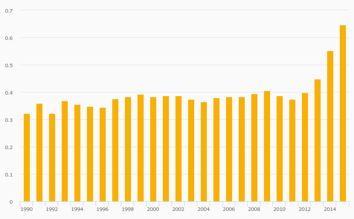 Gross Natural Gas Production (As % of Worldwide Production) rose 17.1% to 0.647% in Bahrain in 2015