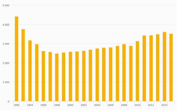 Total Petroleum Consumption fell 2.84% to 3,512 '000 bpd in Russia in 2015
